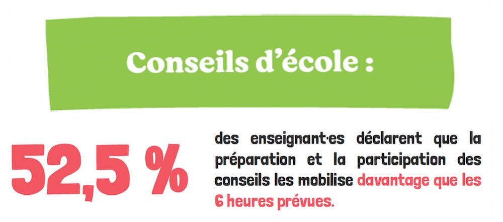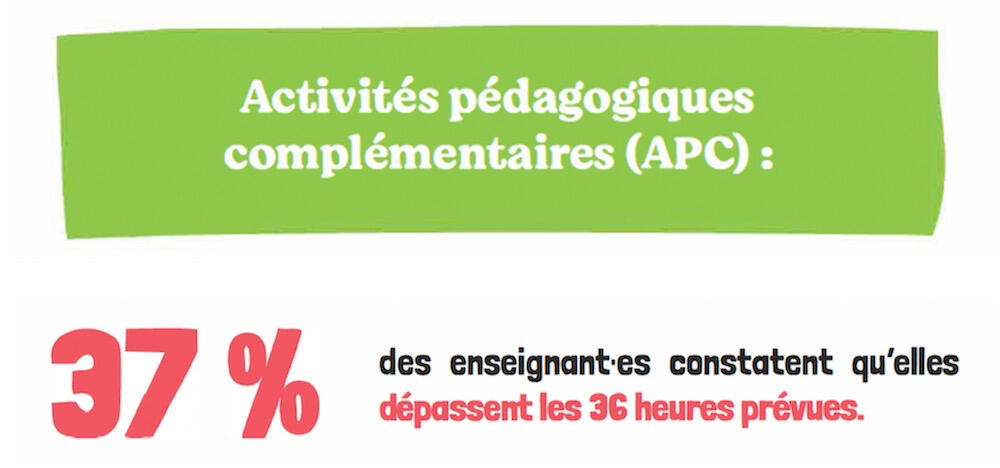 Les 108 heures annuelles prévues dans les textes se partagent entre les APC (36 h), les temps de concertation avec les différents partenaires de la communauté éducative (48 h), les conseils d’écoles (6 h) et la formation (18 h).L’enquête de la FSU-SNUipp montre que pour l’ensemble des professeur·es des écoles, le temps consacré à tout ou partie de ces tâches est sous-évalué :