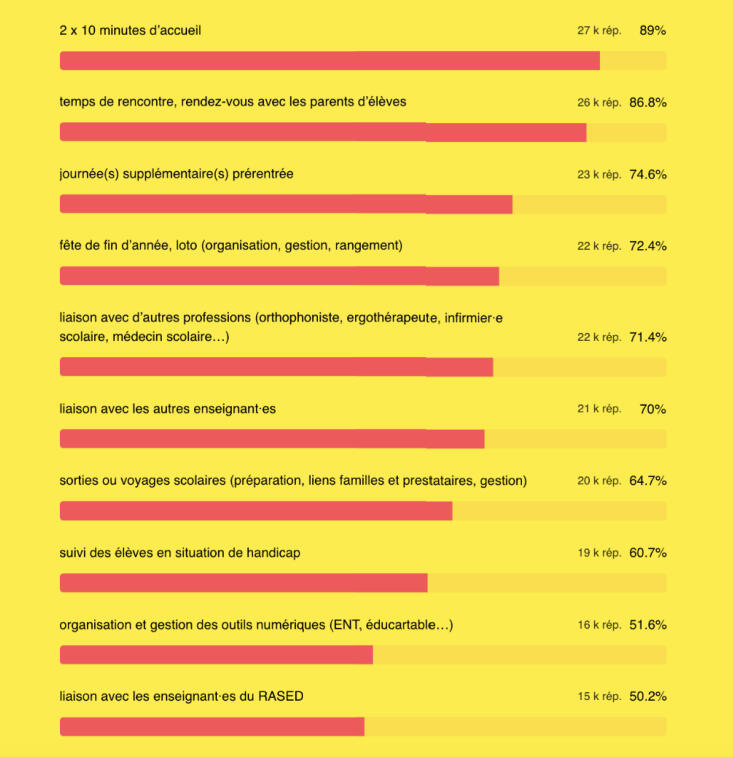 La quasi-totalité des enseignant·es (97%) passe plus de temps que les 24h théoriques à échanger avec leurs collègues, rencontrer les parents et suivre les élèves en situation de handicap.89 % des enseignant·es soulignent que les temps d’accueil du matin et de l’après-midi ne sont pas décomptés de leur temps de travail. Ces moments, qui leur sont par ailleurs imposés, constituent souvent des temps d’échange importants avec les parents d’élèves.